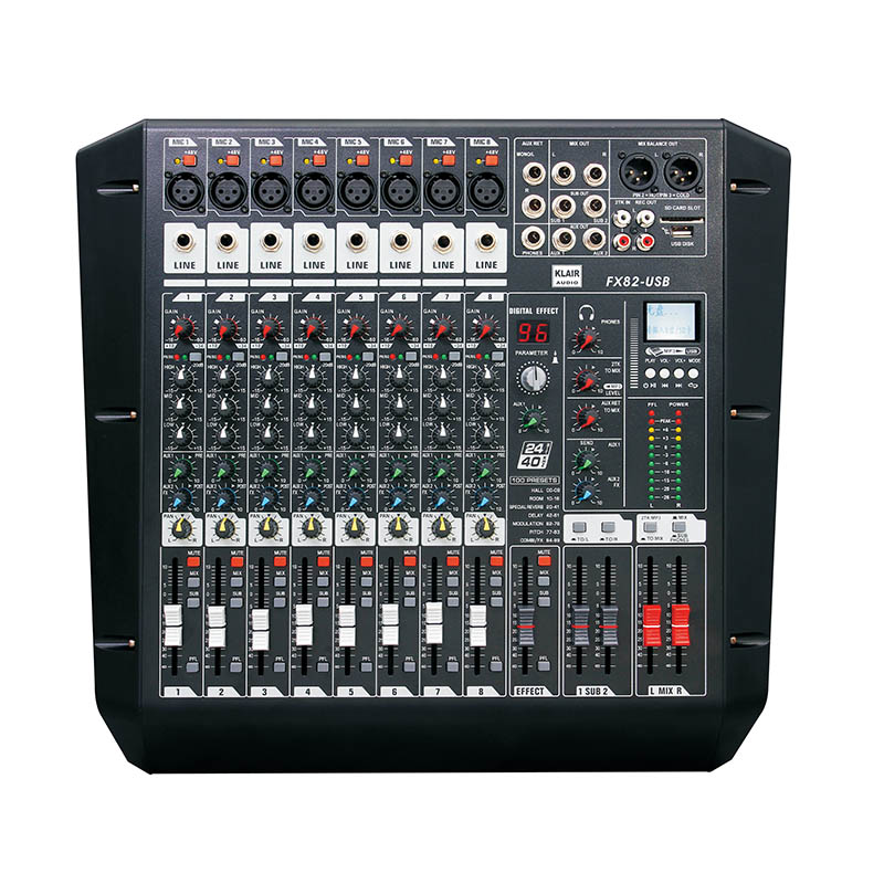 8路調音臺(可上機柜)-TX-FX8 超薄、2編組、數碼顯示效果器調音臺,3段英國風格EQ超薄的結構設計,外觀緊湊樸實內置電源,低噪聲8路單聲道輸入,+48V幻像電源 可外接效果器兩組左右主輸出,兩編組輸出監聽功能強大,能分別監聽所有輸入輸出端高品質24bit數字顯示效果器MP3播放器功能,配備SD卡和USB接口可安裝于設備機柜 了解更多詳細資料,請與我們聯系!聯系電話:400-678-1018 技術參數: 頻率范圍 :20Hz-20KHz 信噪比: >90dB 分離度: >80dB 高音 (+-15dB12KHz) 中音 (+-15dB2.5KHz) 低音 (+-15dB80Hz) 輸入阻抗: 40KΩ平衡/20KΩ 輸出阻抗: 200Ω平衡/100Ω不平衡 供電電源: 220V/AC/50Hz 30W 上一篇:沒有了 下一篇:12路調音臺(可上機柜)-TX-FX12